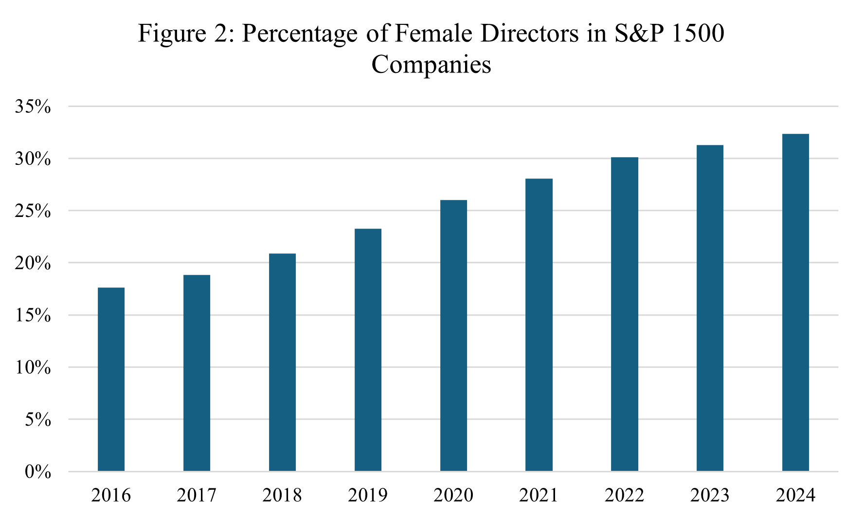 Additionally, Figure 2 below shows that the share of female directors rose steadily from 18% to 32% during the same period. Gormley et al. found that pressure from the Big Three index funds “led American corporations to add at least 2.5 times as many female directors in 2019 as they had in 2016.”[61] They concluded that company boards achieved greater gender diversity by looking beyond managers’ existing networks for candidates and by focusing less on candidates’ executive experience.[62]
