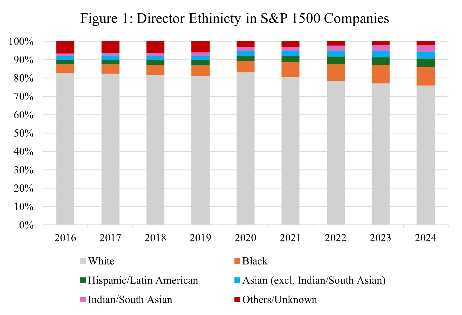 Notwithstanding the arguments on DEI, there are some promising signs of progress in the diversity of corporate management. Even though still significantly underrepresented, the percentage of female CEO in Fortune 500 companies grew from 4.2% in 2016 to 10.4% in 2024.[59] And the number of black CEOs in Fortune 500 companies doubled from four in 2020 to eight in 2024, despite still being at an “abysmally low” of 1.6%.[60] However, director diversity appears to have made greater progress. Using S&P 1500 company data obtained from ISS US Directors, Figure 1 below shows that the share of black directors (marked in orange) rose from under 5% in 2016 to over 10% in 2024. During the same period, the percentage of directors from other minority groups (Asian, Indian, and Hispanic) also grew but not as significantly as black directors.
